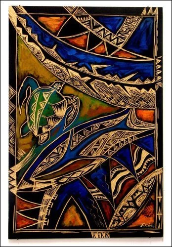 Tokelau has a tradition of ta tatau tattooing, although no longer practiced Jack has taken motifs of this tradition and has used these mamanu patterns to carve wood blocks images that celebrates Tokelau art.